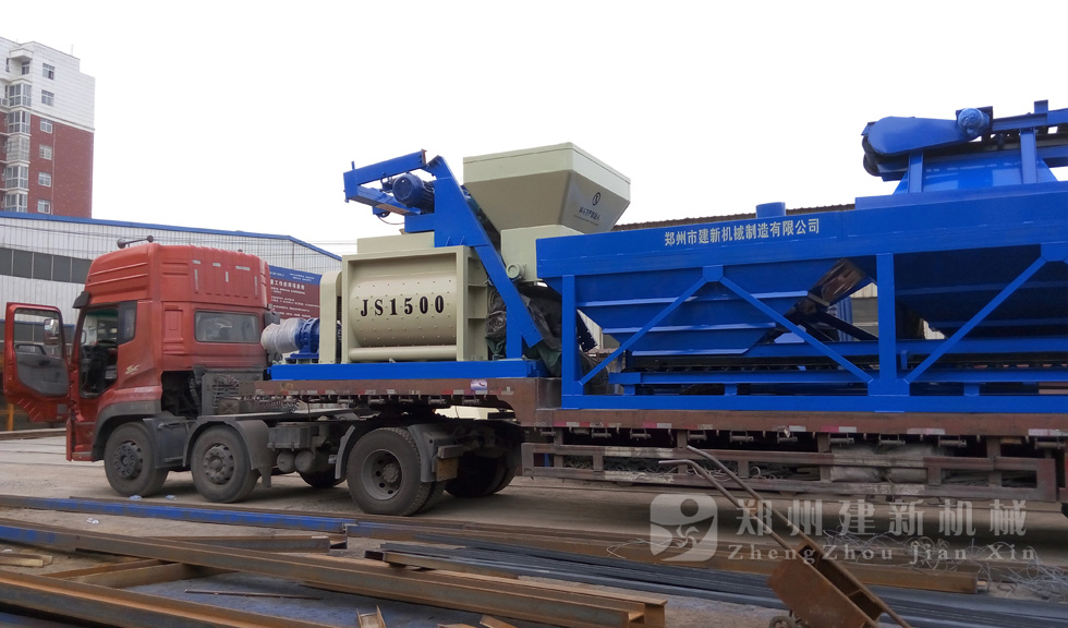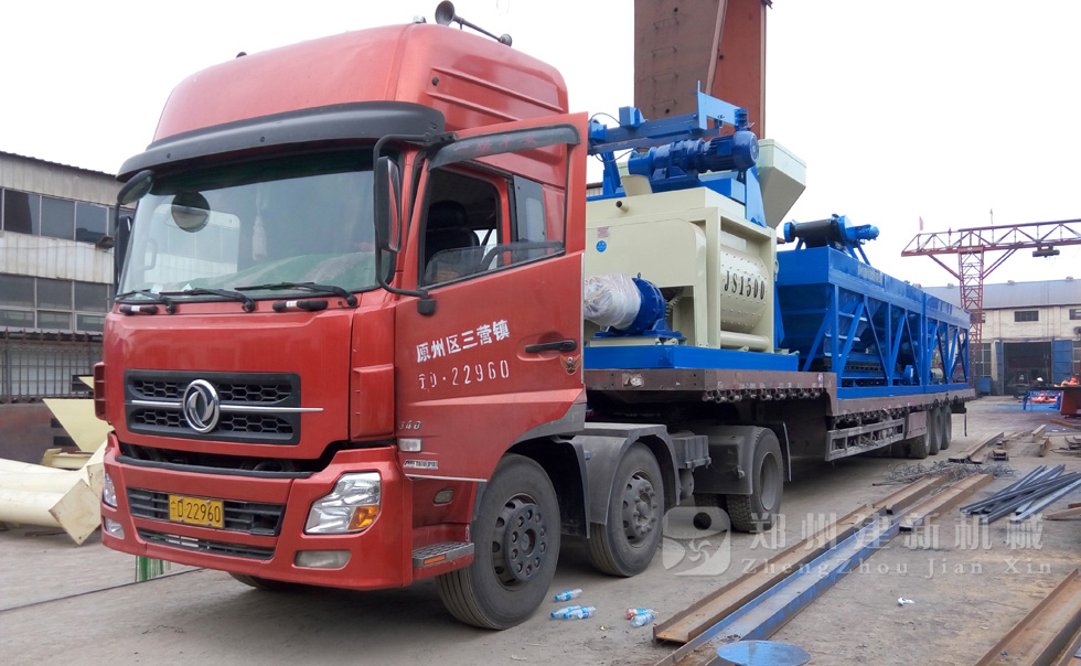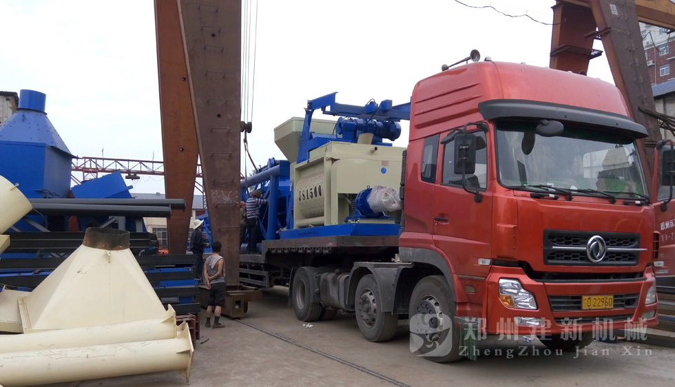 2015年7月13日,鄭州建新再發(fā)一套HZS75混凝土攪拌站設(shè)備,發(fā)往甘肅省。圖為JS1500混凝土攪拌機(jī)以及PLD2400混凝土配料機(jī)裝車過程。