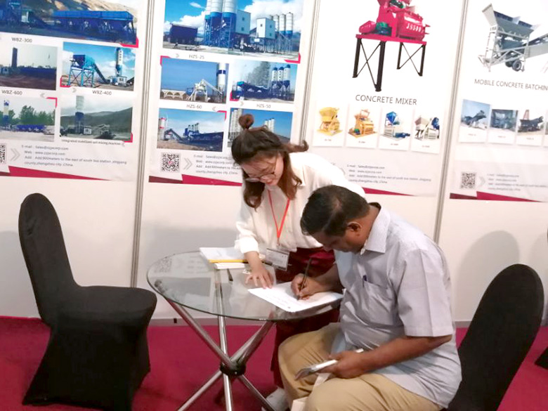 混凝土攪拌站、WBC系列穩(wěn)定土拌合站等產(chǎn)品吸引了絡(luò)繹不絕的觀展者駐足洽談。接待人員不失時(shí)機(jī)地向來觀展的客戶介紹建新機(jī)械的技術(shù)優(yōu)勢(shì)、產(chǎn)品特點(diǎn)、售后服務(wù)及銷售代理政策,其熱情的講解受到了廣大斯里蘭卡客戶和當(dāng)?shù)毓こ虣C(jī)械人士的關(guān)注,部分客戶當(dāng)場(chǎng)展開了詳細(xì)的商談。
